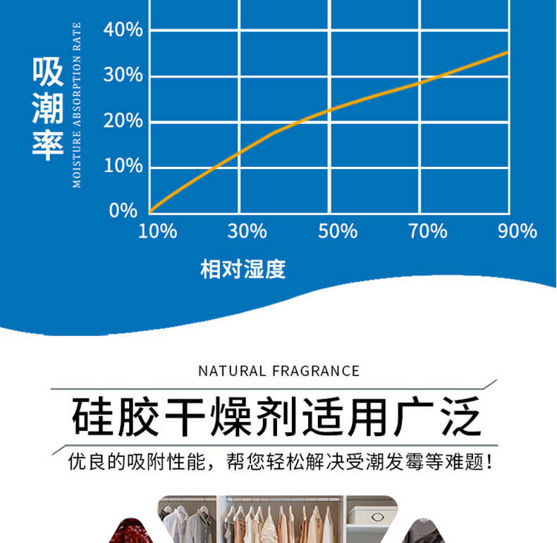 特点:硅胶干燥剂是一种高活性吸附材料,通常是用硅酸钠和硫酸反应,并经老化,酸泡等一系列后处理过程而制得。硅酸属于非晶态物质,其化学分子式mSiO2、nH2O。不容于水和任何溶剂。无毒无味,化学性质稳定,除强碱、氢氟酸外不与任何物质发生反应。各种型号的硅胶因其制造方法不同而形成不同的微孔结构。硅胶的化学组织和物理结构,决定了它具有许多与其它同类材料难以取代的特点:吸附性能强、热稳定性好、化学性质稳定/有较高的机械强度等。