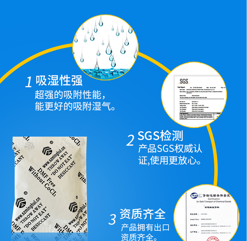 特点:硅胶干燥剂是一种高活性吸附材料,通常是用硅酸钠和硫酸反应,并经老化,酸泡等一系列后处理过程而制得。硅酸属于非晶态物质,其化学分子式mSiO2、nH2O。不容于水和任何溶剂。无毒无味,化学性质稳定,除强碱、氢氟酸外不与任何物质发生反应。各种型号的硅胶因其制造方法不同而形成不同的微孔结构。硅胶的化学组织和物理结构,决定了它具有许多与其它同类材料难以取代的特点:吸附性能强、热稳定性好、化学性质稳定/有较高的机械强度等。