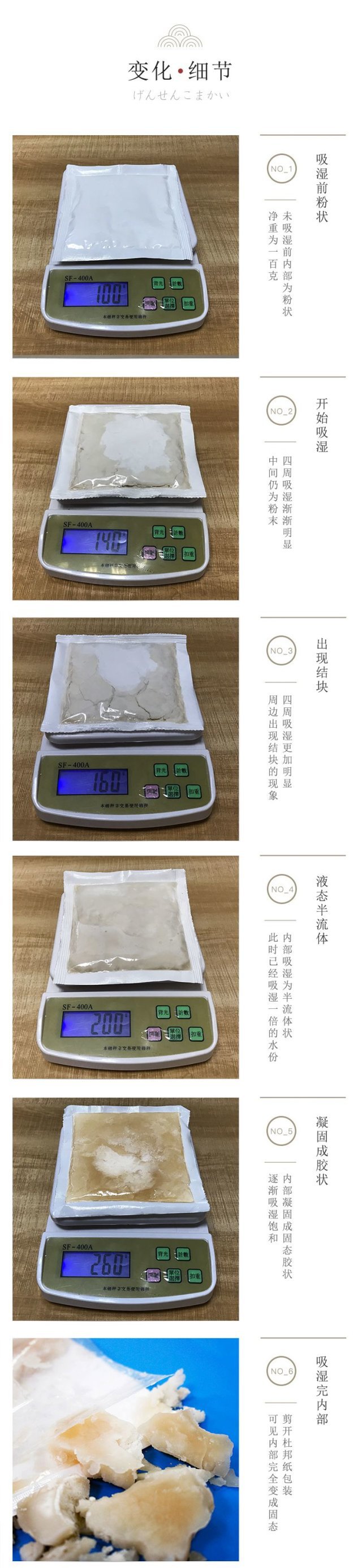 氯化钙干燥剂是白色粉末状的,具有极强的吸潮性,而且吸潮的周期长,可持续60天不断吸潮,在湿度90%温度25度的情况下进行测试,10天内可以达到本身重量的100%,60天内最高饱和可达自身重量的200%,是目前市场上吸潮性能最强的一款防潮产品,外包装一般采用PET和特卫强杜邦纸,把水分吸进去不渗透出来,受潮之后由粉末状变成了胶凝体,很明显能观测到受潮后的形状,受潮前和受潮后的变化较为明显,不能以假乱真。