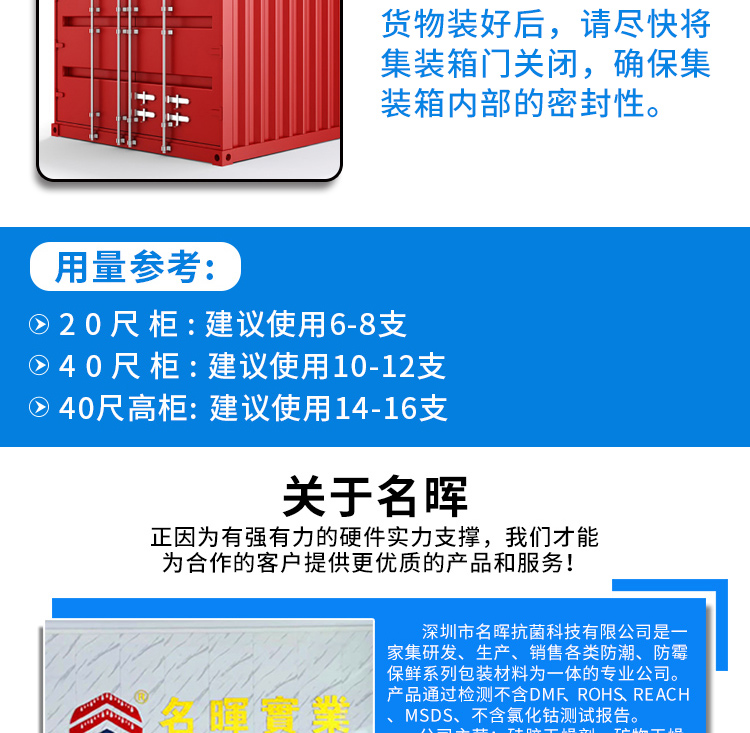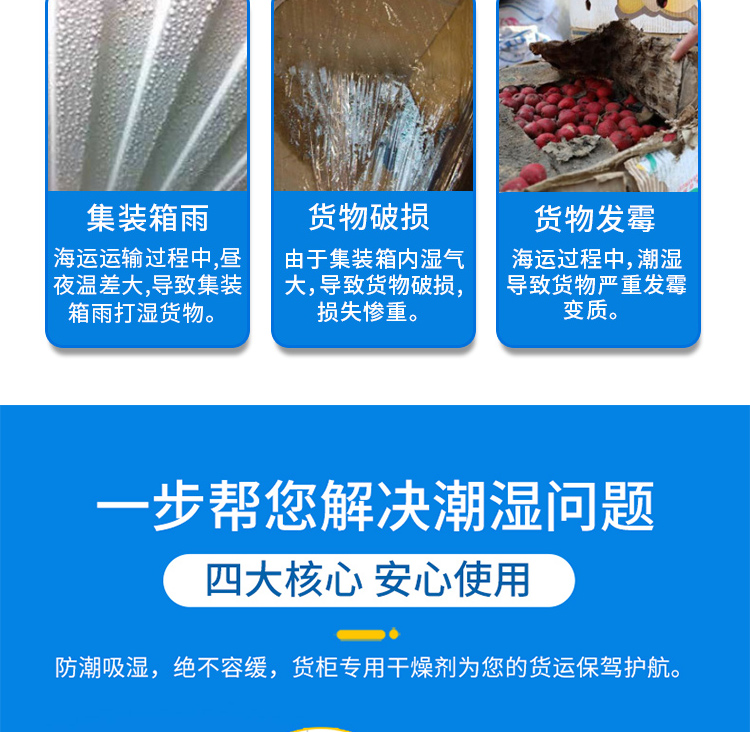 集装箱在运输的过程中会因不同温度、湿度的变化而出现水蒸汽凝结的现象,采用集装箱干燥剂可降低露点而使集装箱的凝水现象得到控制,使内装货物免受侵害。集装箱干燥剂吸水后仍能保持外观干燥且不产生任何污染,是绿色环保型的防潮产品。
