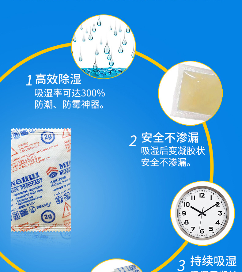 氯化钙干燥剂是白色粉末状的,具有极强的吸潮性,而且吸潮的周期长,可持续60天不断吸潮,在湿度90%温度25度的情况下进行测试,10天内可以达到本身重量的100%,60天内最高饱和可达自身重量的200%,是目前市场上吸潮性能最强的一款防潮产品,外包装一般采用PET和特卫强杜邦纸,把水分吸进去不渗透出来,受潮之后由粉末状变成了胶凝体,很明显能观测到受潮后的形状,受潮前和受潮后的变化较为明显,不能以假乱真。
